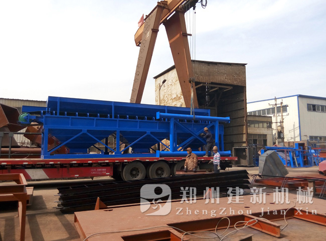 鄭州建新機械制造有限公司貨場上,一臺PLD1600三倉砂石配料機正在做著最后的檢驗工作,準備發(fā)貨。據(jù)了解,這臺PLD1600砂石配料機與前兩天發(fā)出的JS1000混凝土攪拌機是同一批設備,為一套HZS60混凝土攪拌站。